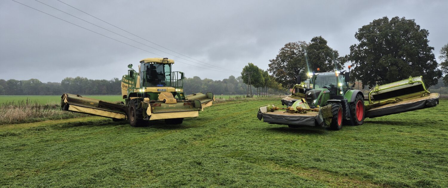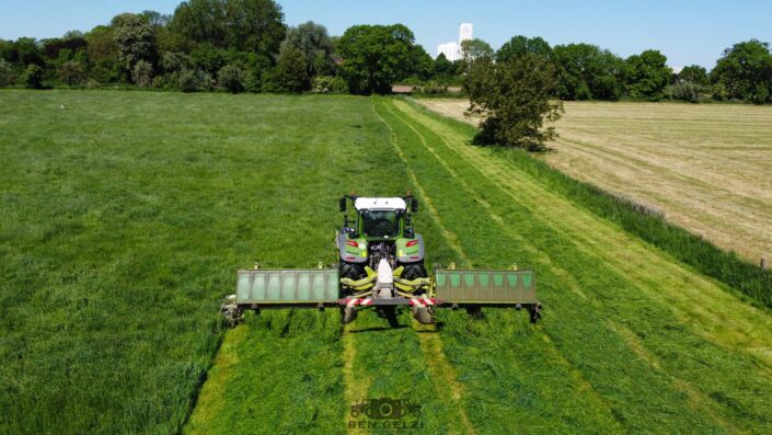 Bei einseitig geöffneter Schwadhaube legt der BiG M einseitig breit ab. Nach einer Hin und Rückfahrt liegen bis zu 19,40 Meter Arbeitsbreite auf nur 12 Metern und lassen sich bequem in einem Arbeitgang mit unserem Claas Liner 4000 zu einem Schwad zusammenführen.